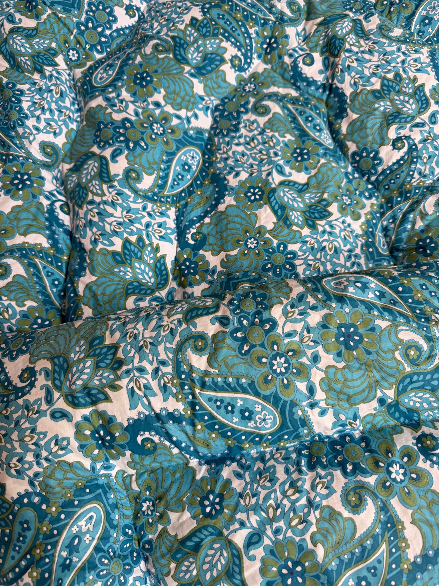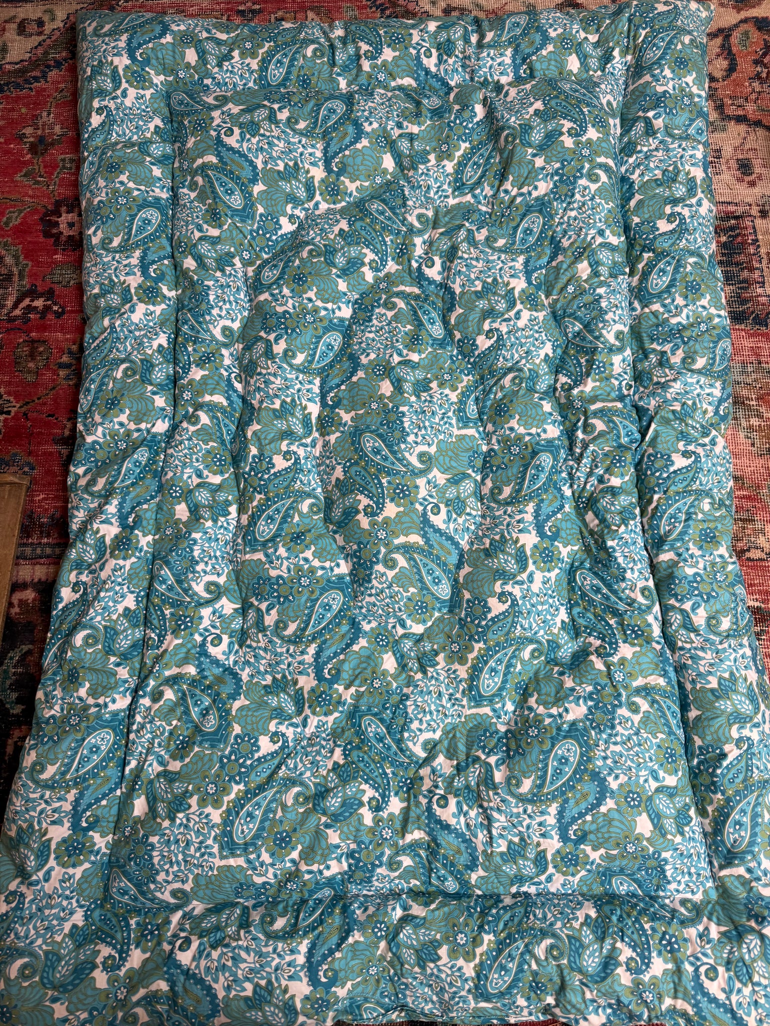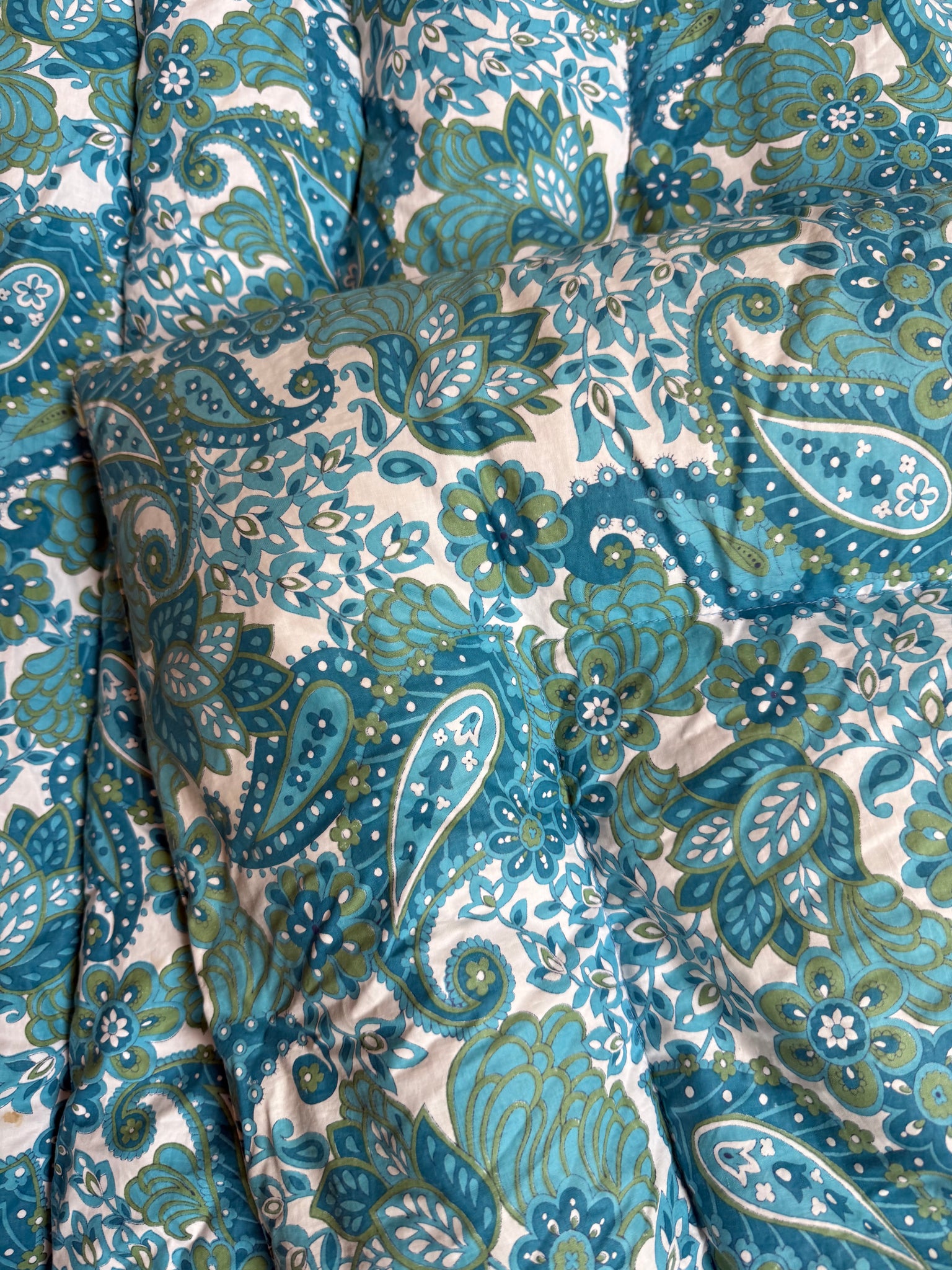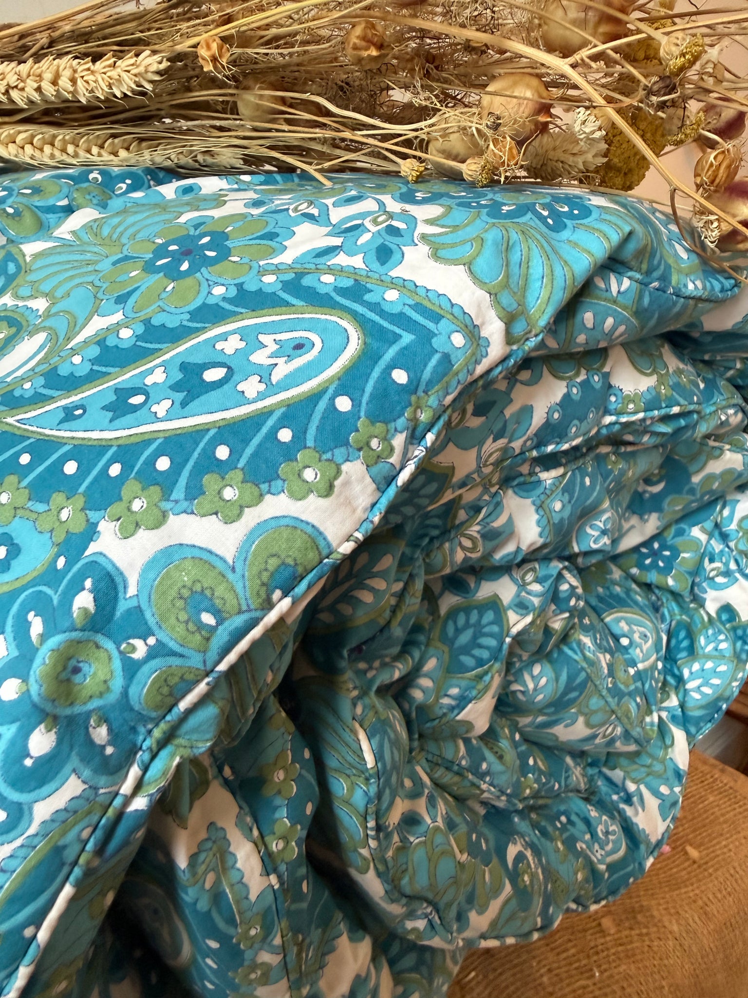 Beautiful vintage retro Paisley Eiderdown, in the most gorgeous blues, turquoise and a very gentle pink background. This is in stunning condition, soft, squishy and ready to be used.