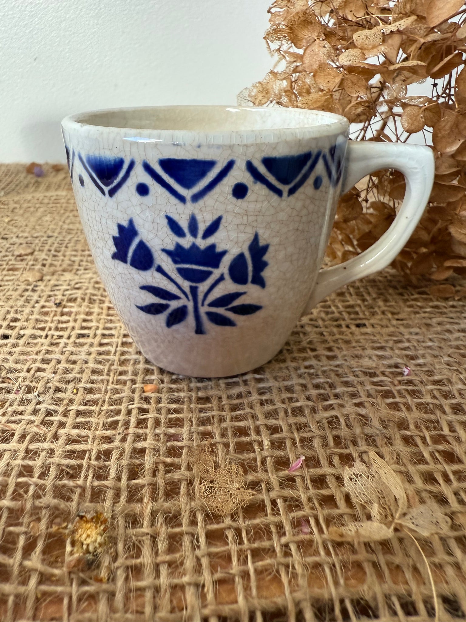 French vintage crazed and buttery little cup, lovely blue transferware. 6 cm x 9 handle to edge.,