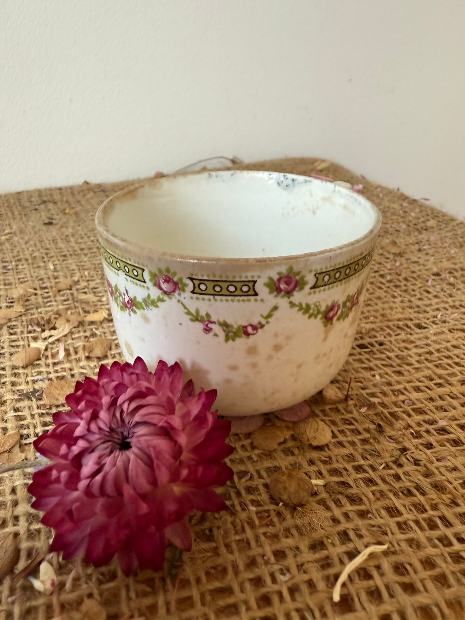 Cute French Buttery Sarreguimes cup.. love love love little cups at the moment starting a collection but anyway this one’s got to go 9 cm from handle x 5 cm.