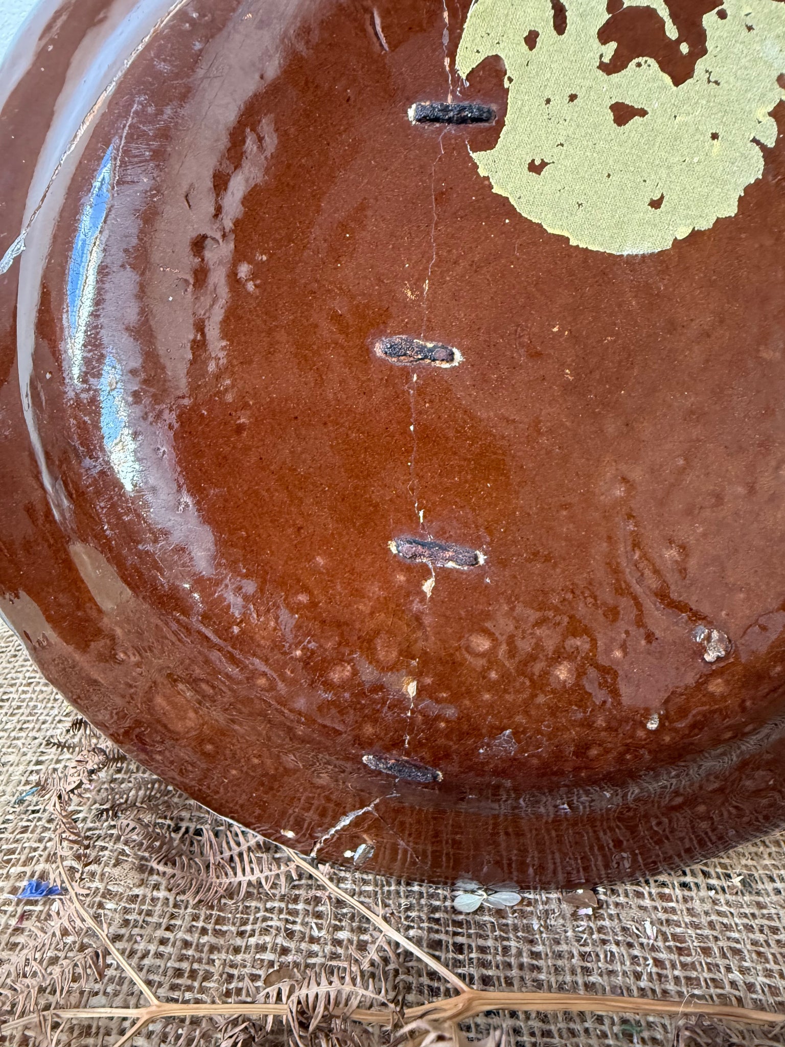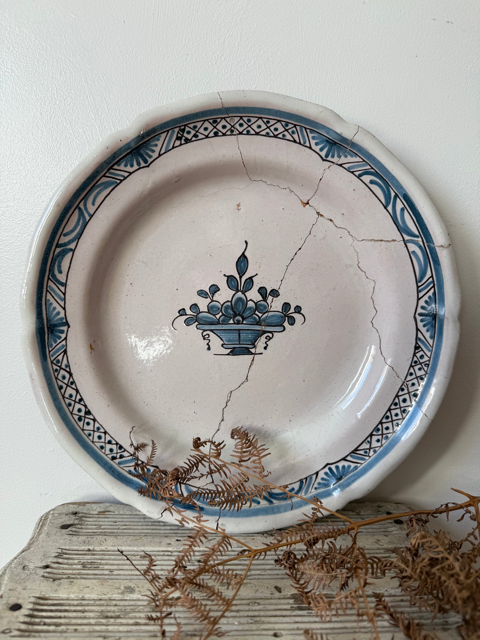 Antique French blue and white pottery stapled dish. Certainly make do and mend such a craft to be able to do this and it’s such a beautiful piece as well 31 cm. You could show off both sides and switch between the 2!