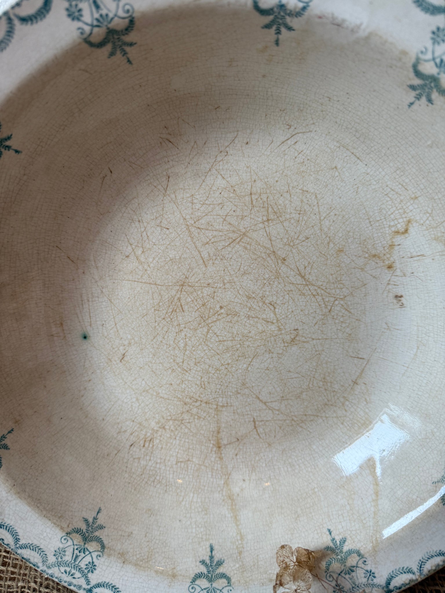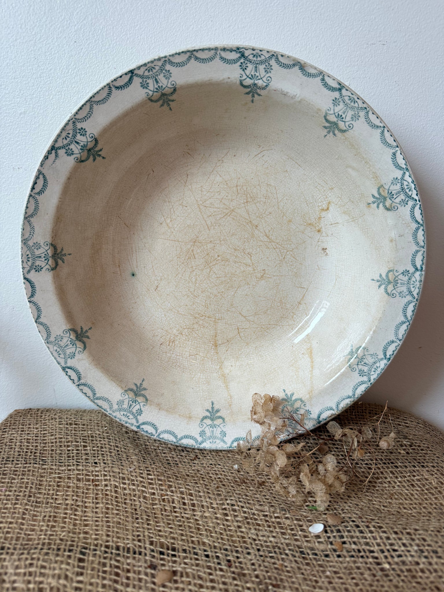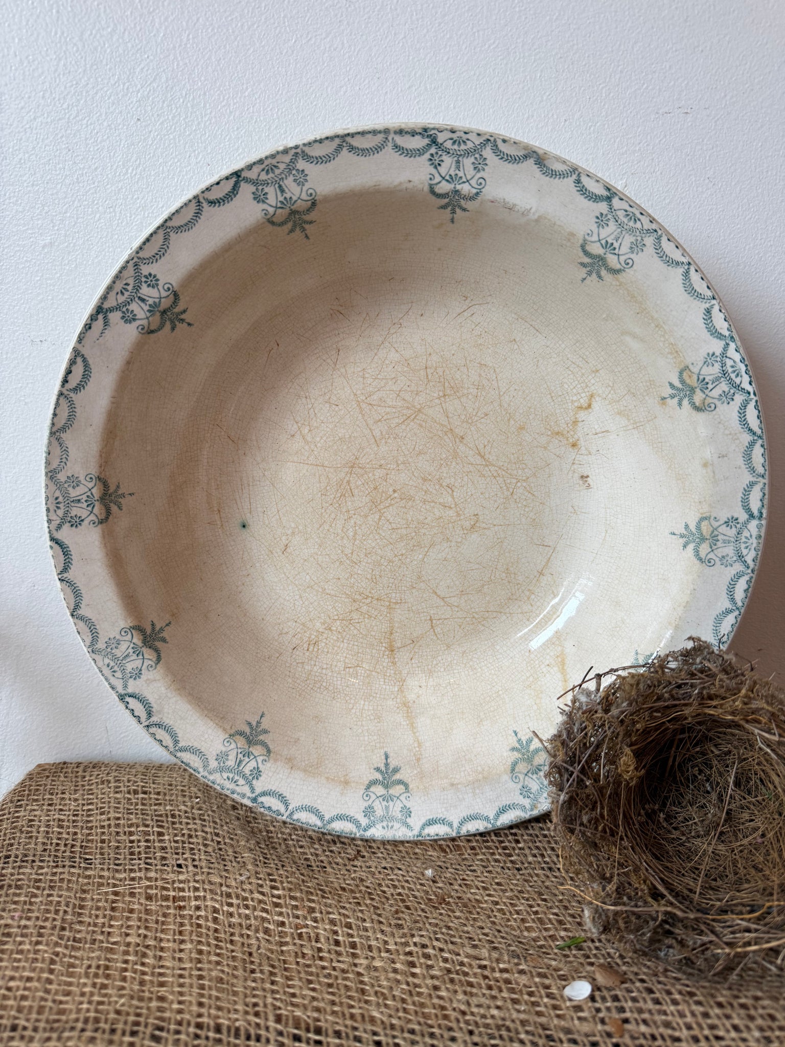 French ironstone delicated green rimmed dish 28cm x 6cm, has been well loved, that’s what I love about it 💚