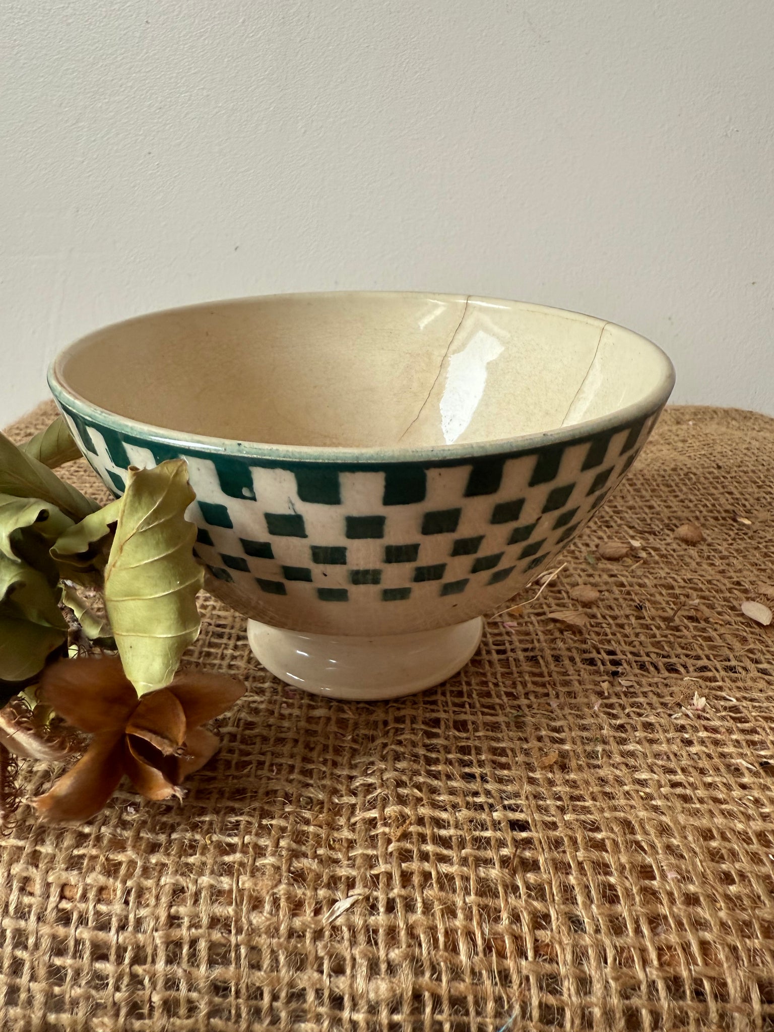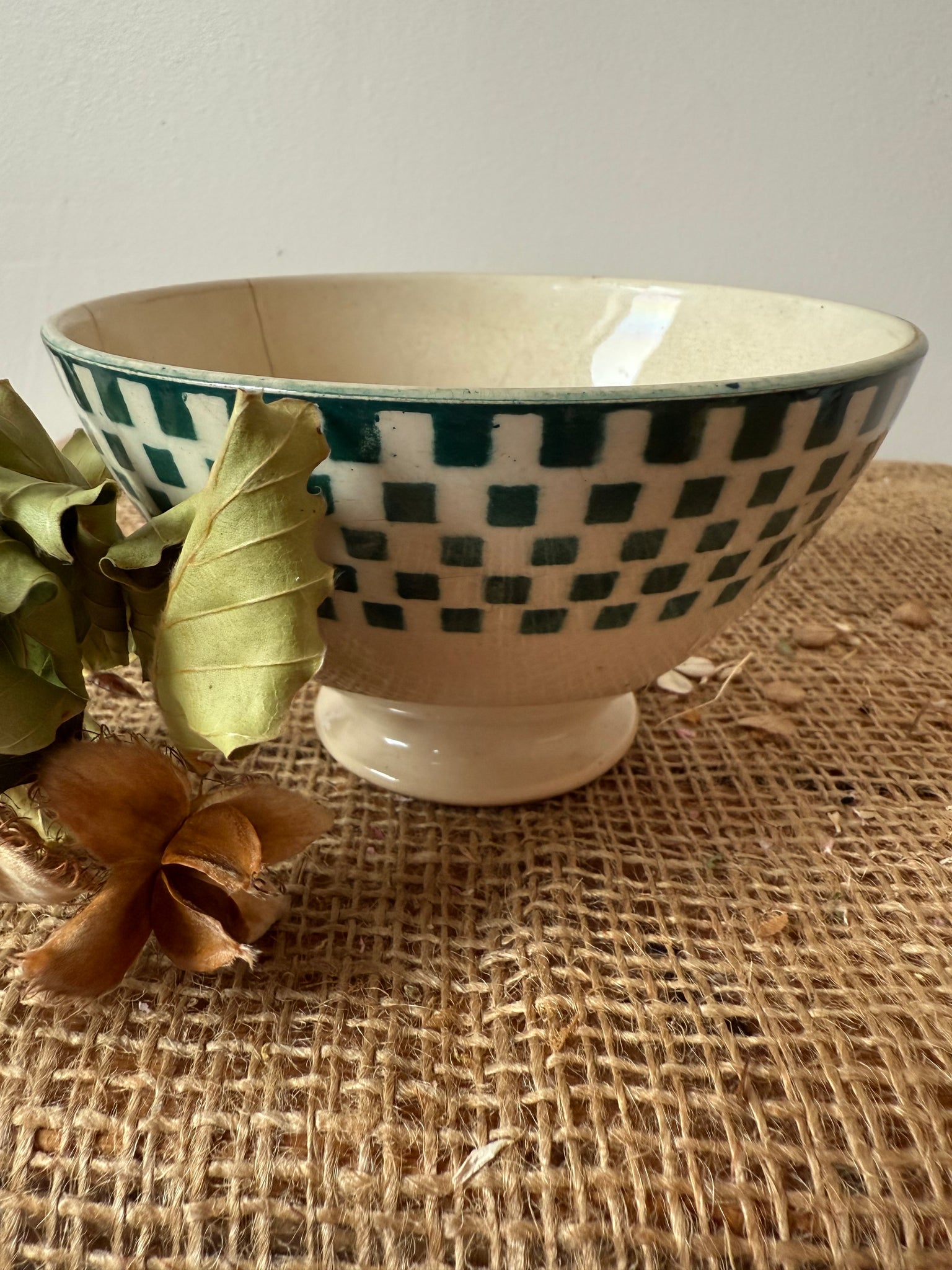 Cute French gently stained café au lait in a checked green pattern does have a couple of hairlines 13 cm x 8 cm