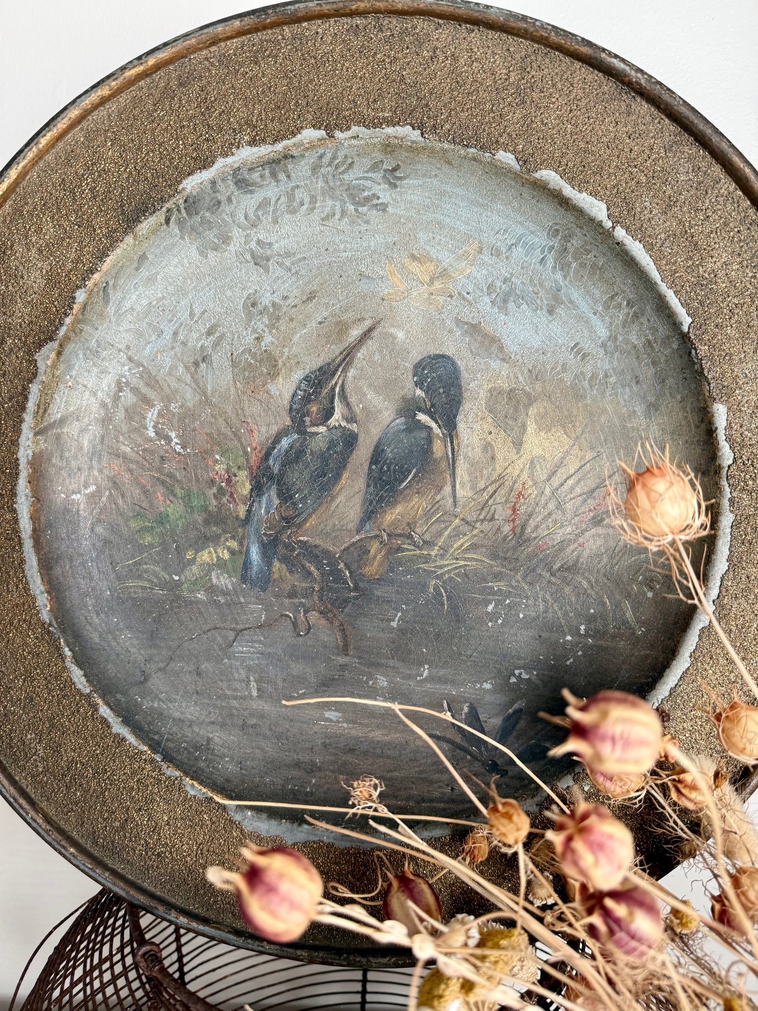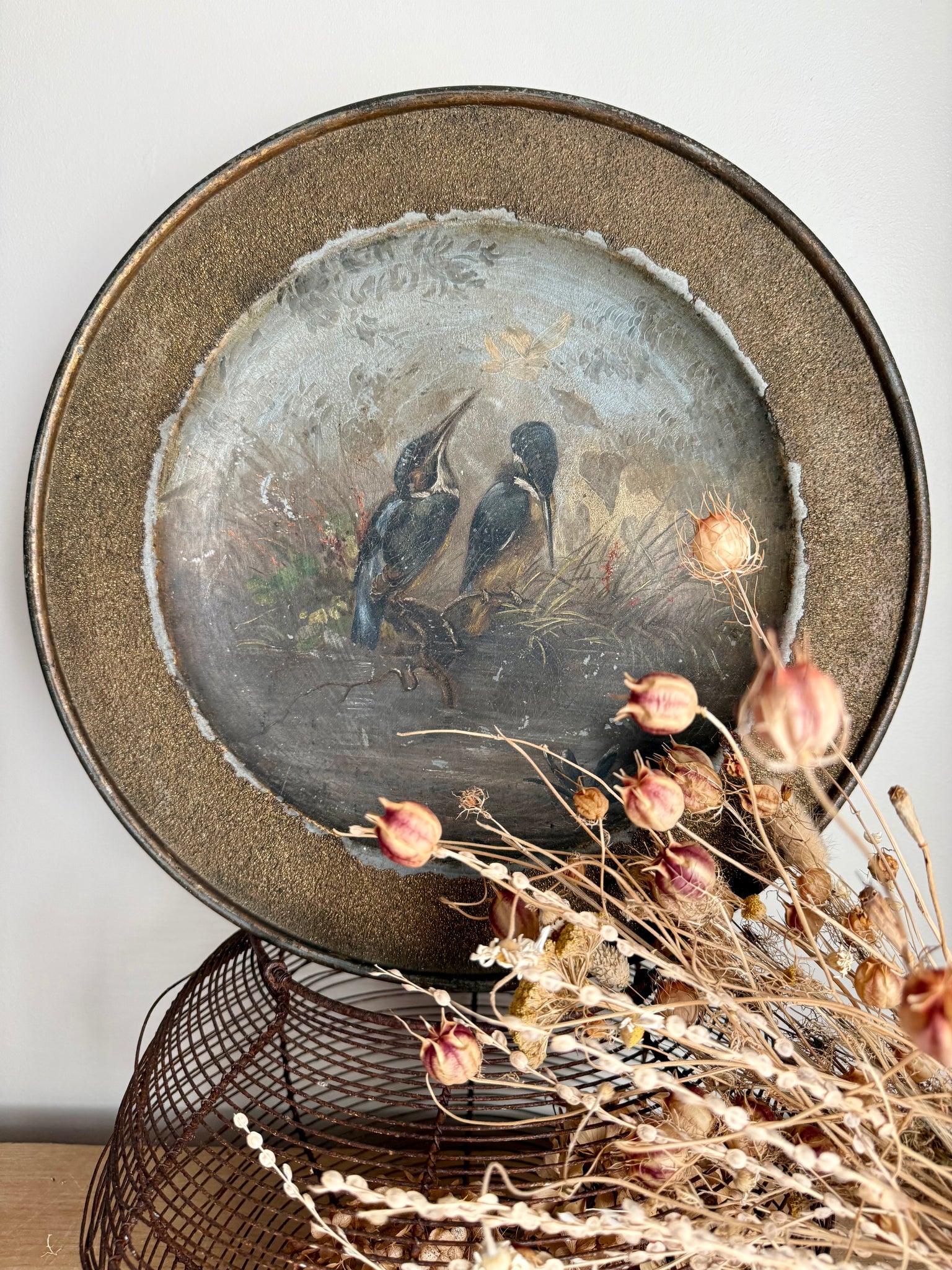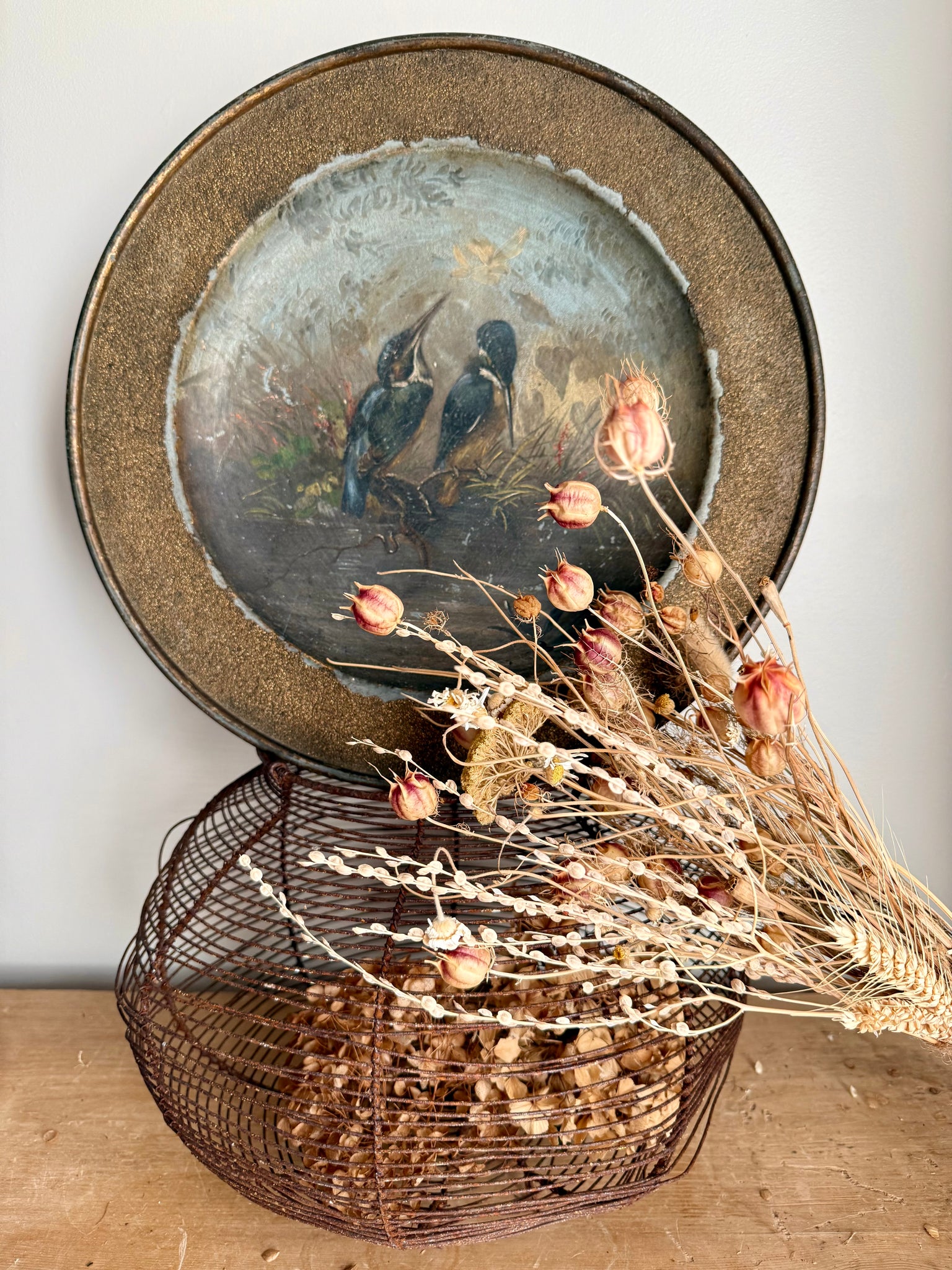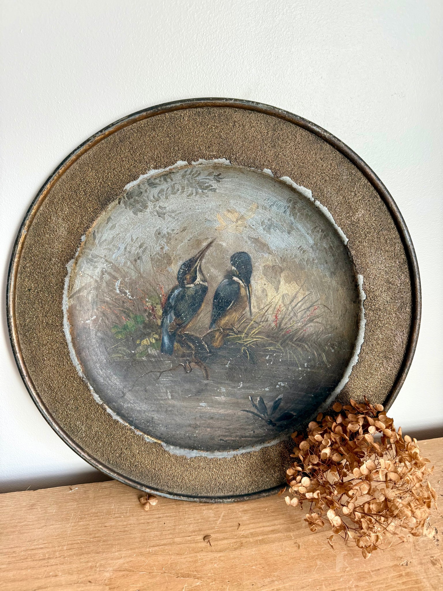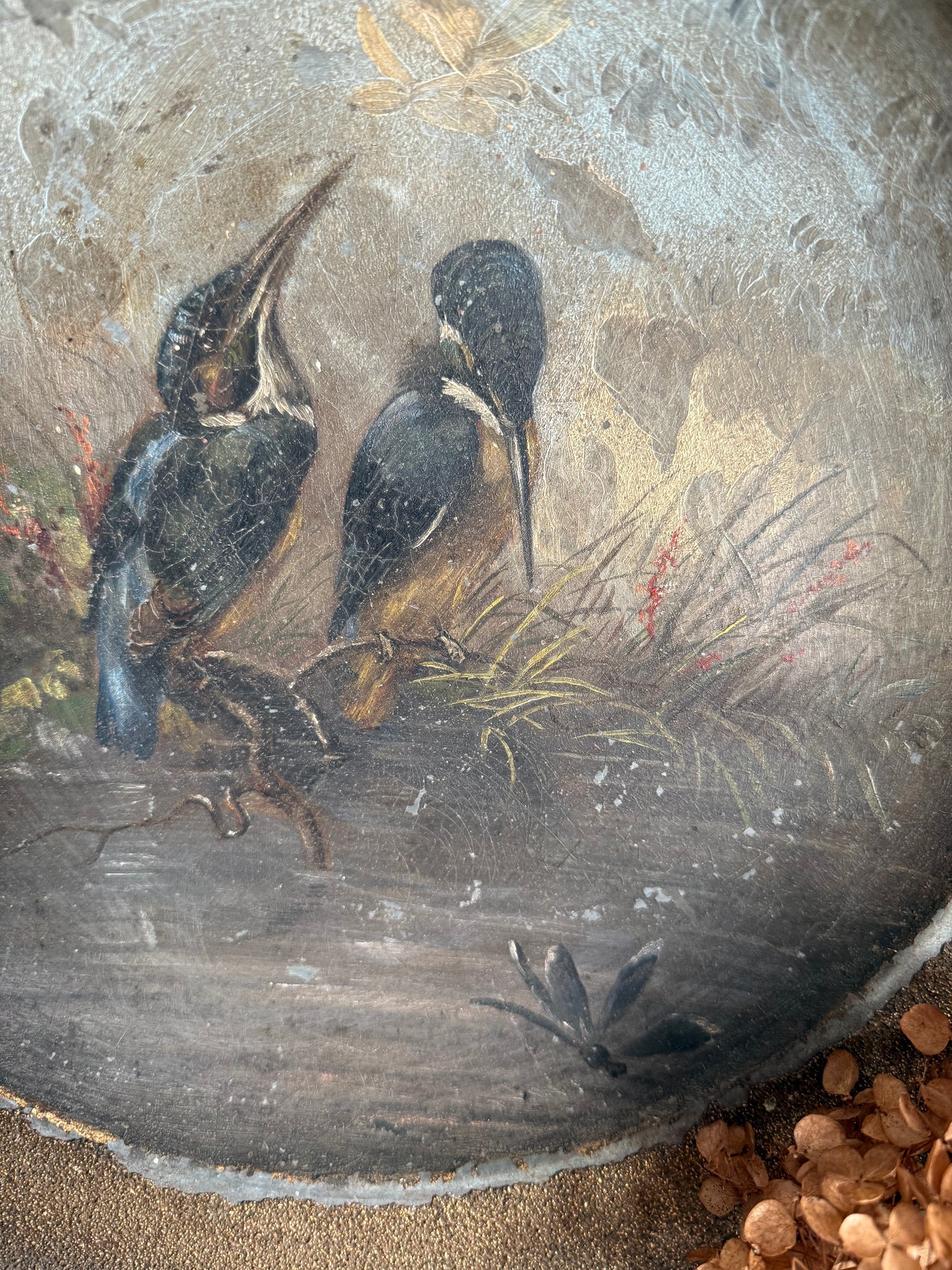 I love this and kingfishers are one of my favourite birds, French handpainted kingfishers, painted on a metal charger. This really is a very special piece, the kingfishers are beautifully painted. It is quite a dark piece but it’s just stunningly beautiful. A little dragonfly darts near the water towards the bottom. 41 cm