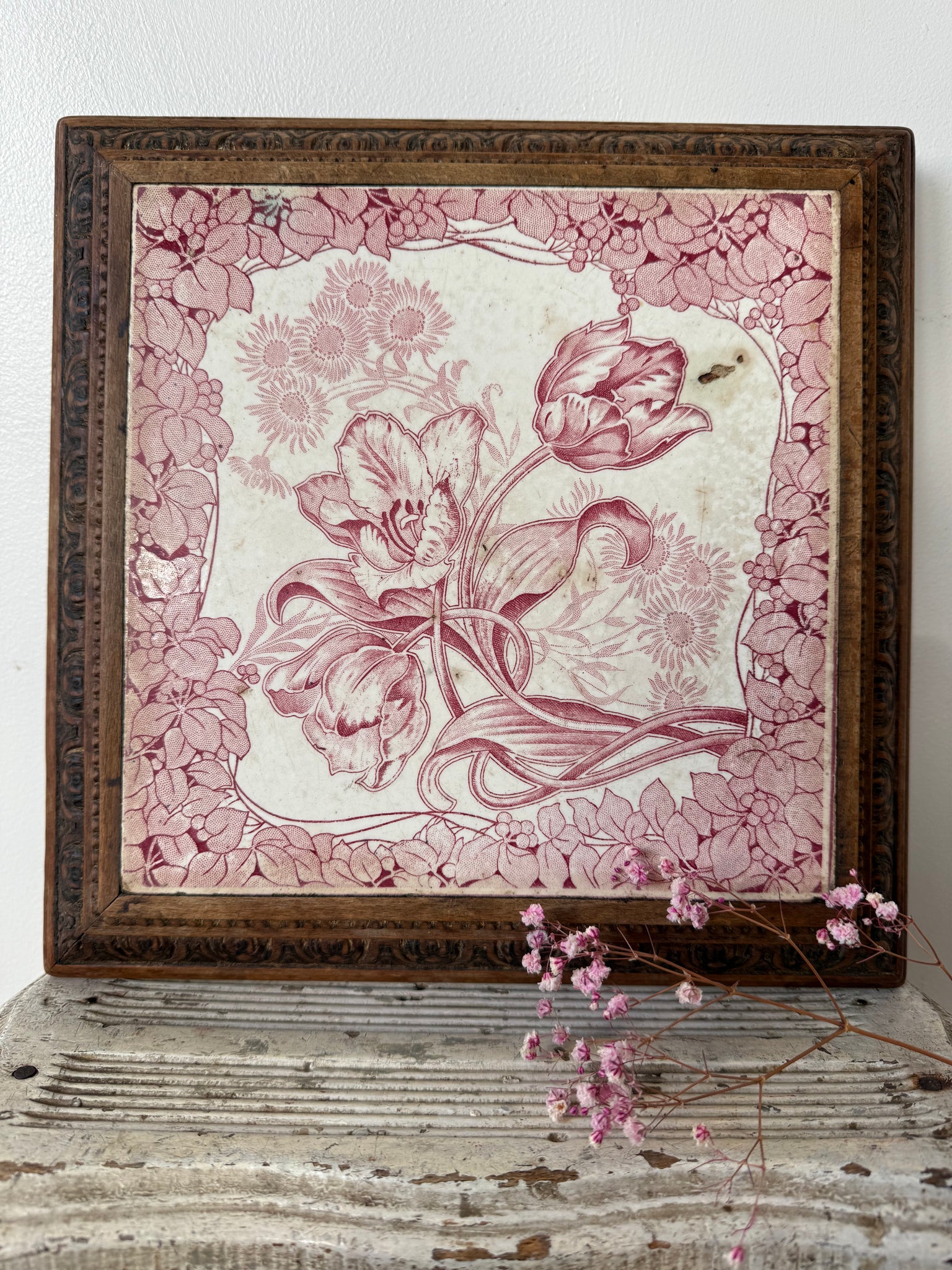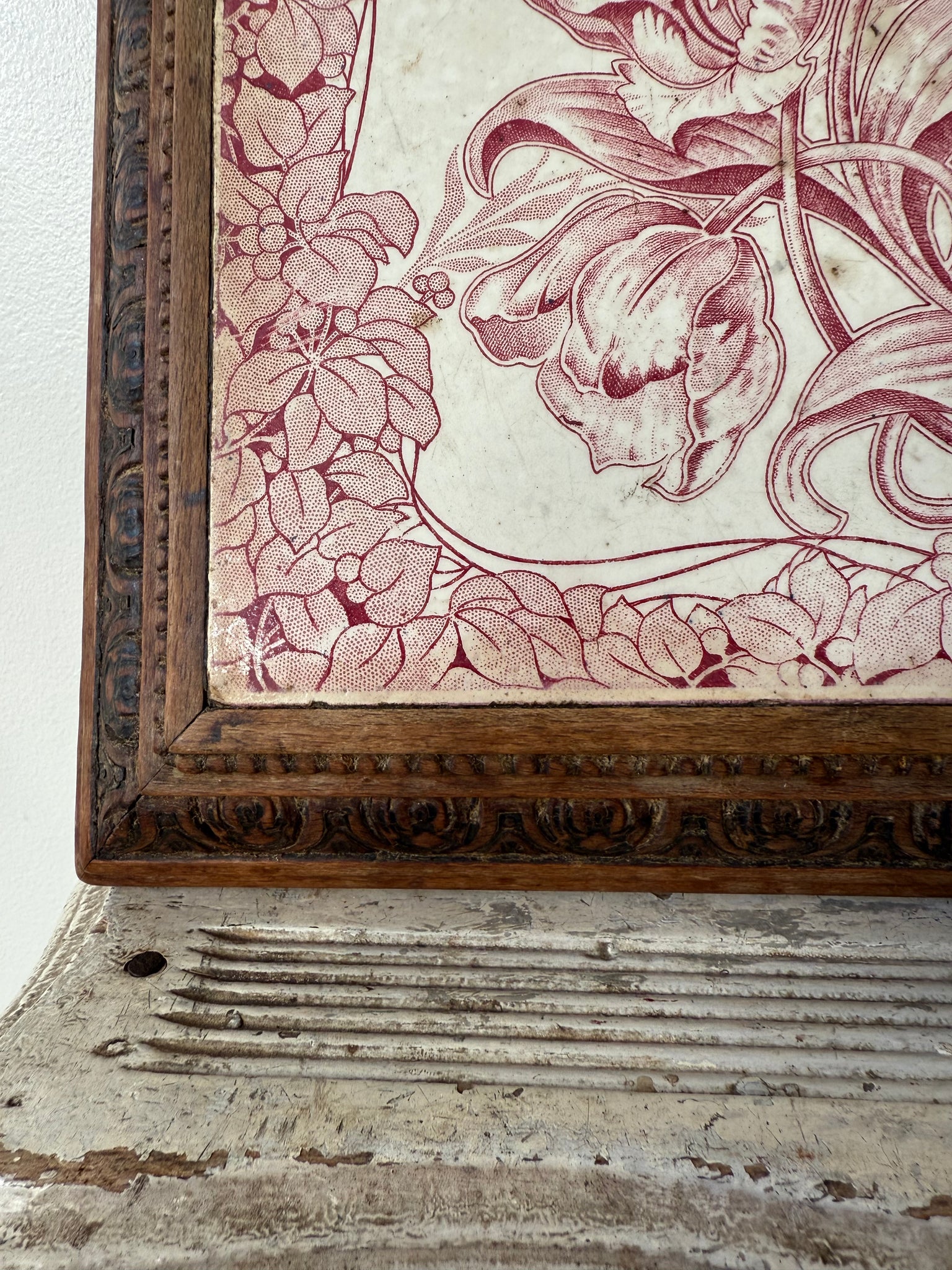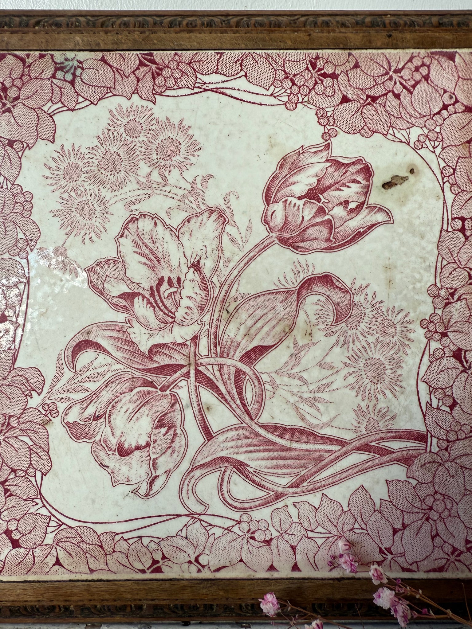 Pretty French tulip tiled trivet on a wooden base sometimes turned into musical boxes this one however, is beautifully carved on the outside 28 cm tile size is 21 cm. This would make a great unusual Christmas gift