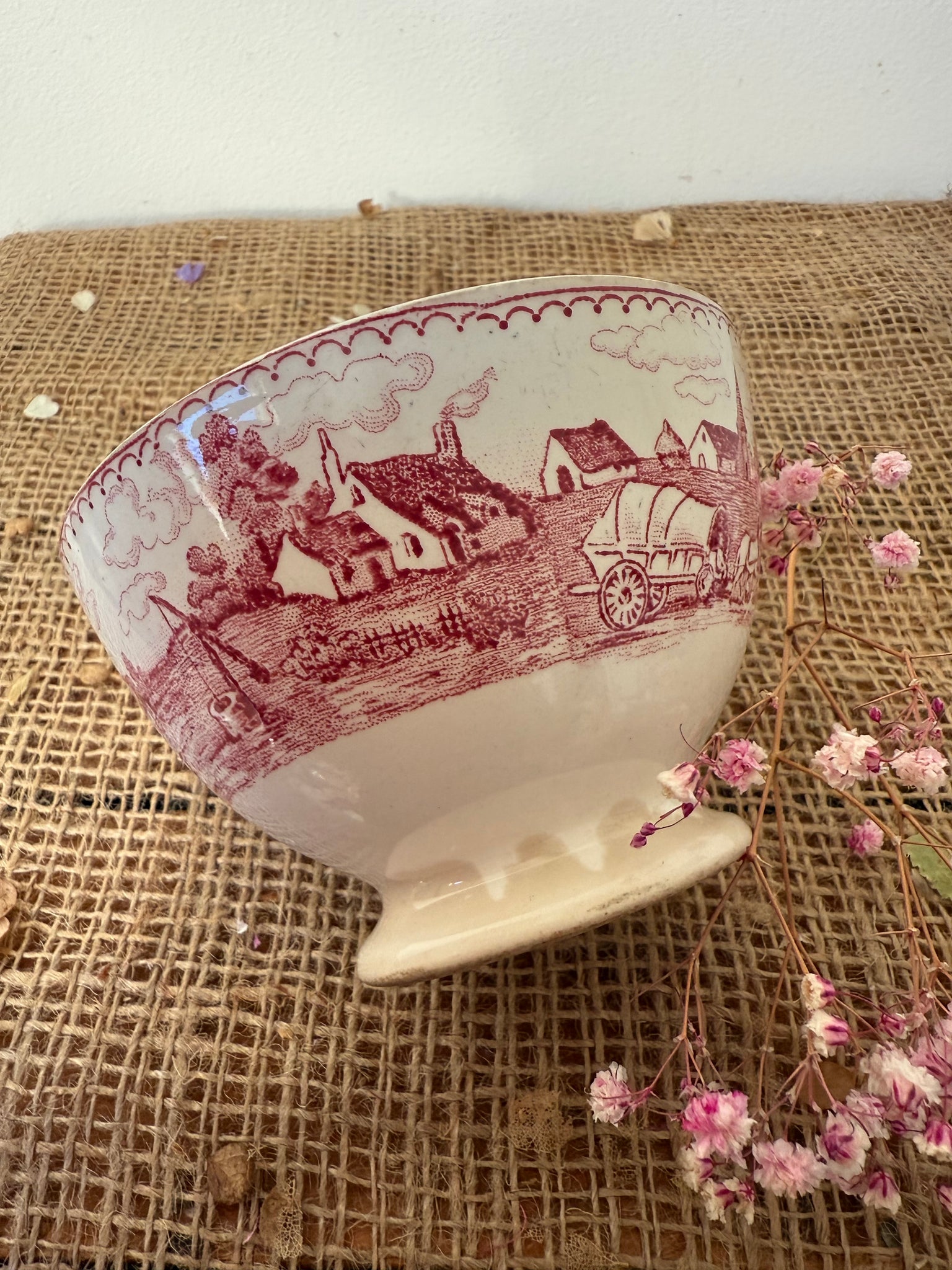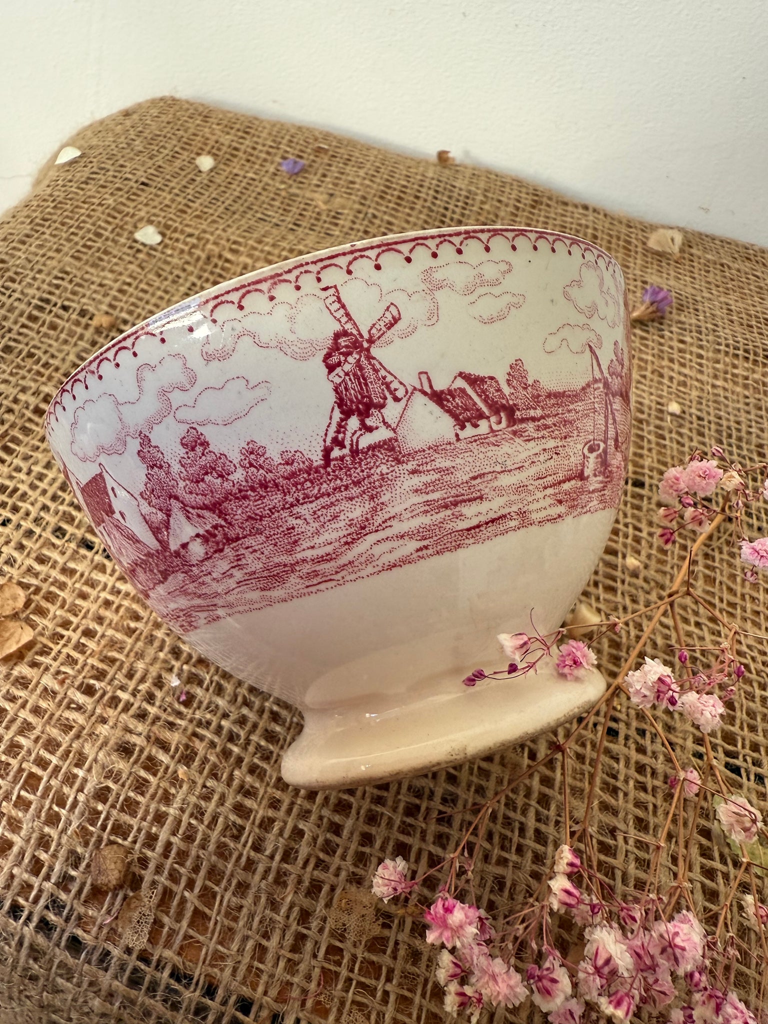 French pink ironstone cage au lait, 11 cm x 7.5 cm depicting country scenes of windmills villages churches a very pretty piece