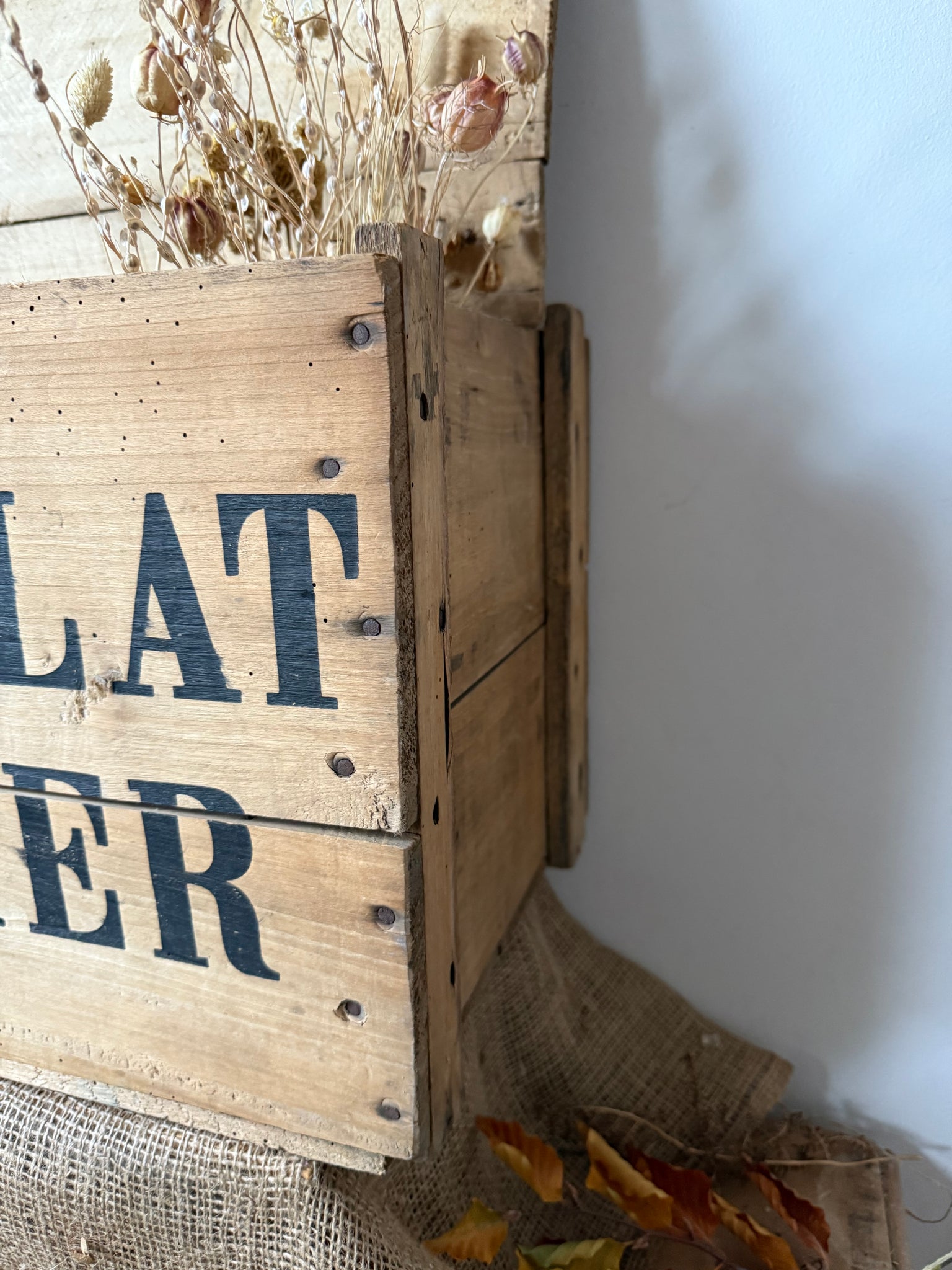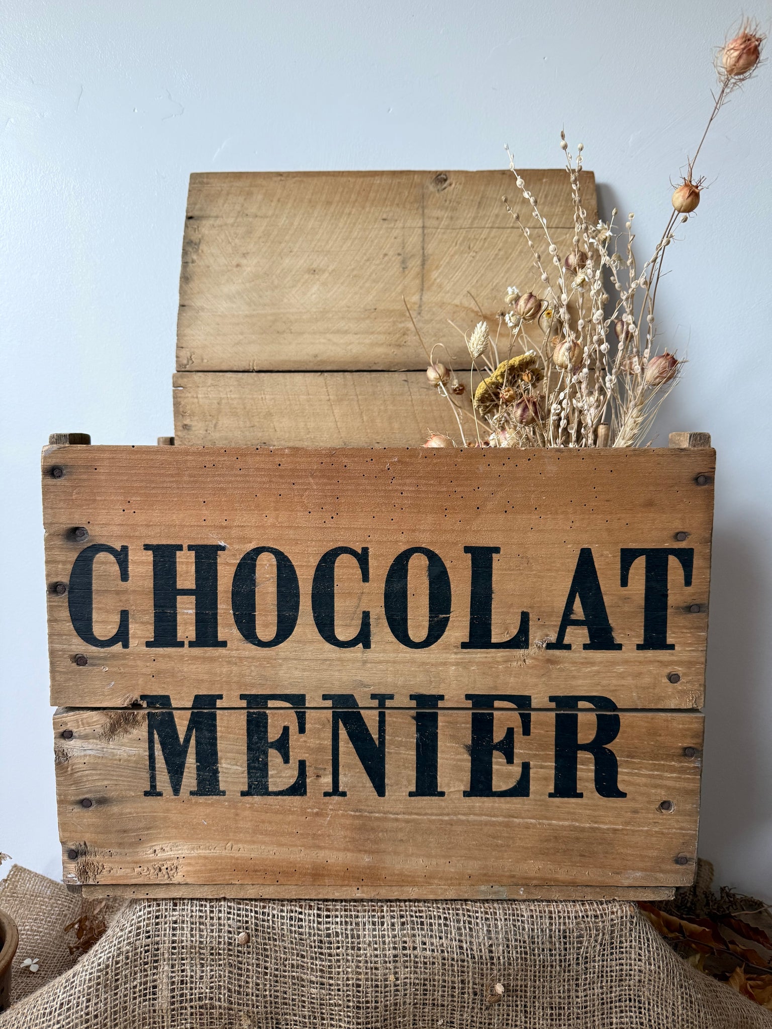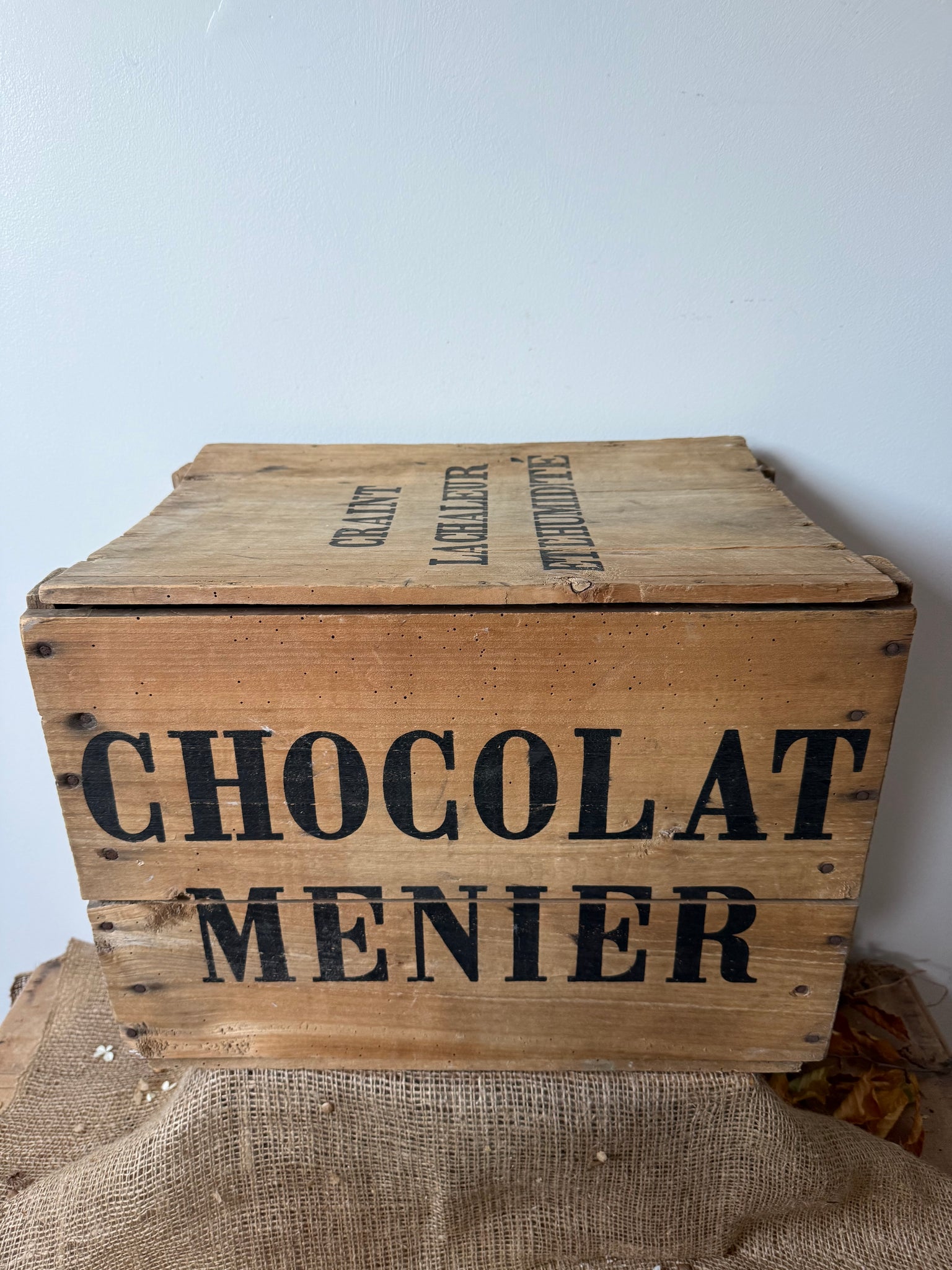 Super French vintage chocolat menier crate, this is such a great size. Not too big or too small, would be great as a storage box by the side of the sofa or we use ours in the lounge as a coffee table.. A Christmas tree looks amazing in it!! 45 x 31 x 32cm does have a loose lid which is slightly warped.