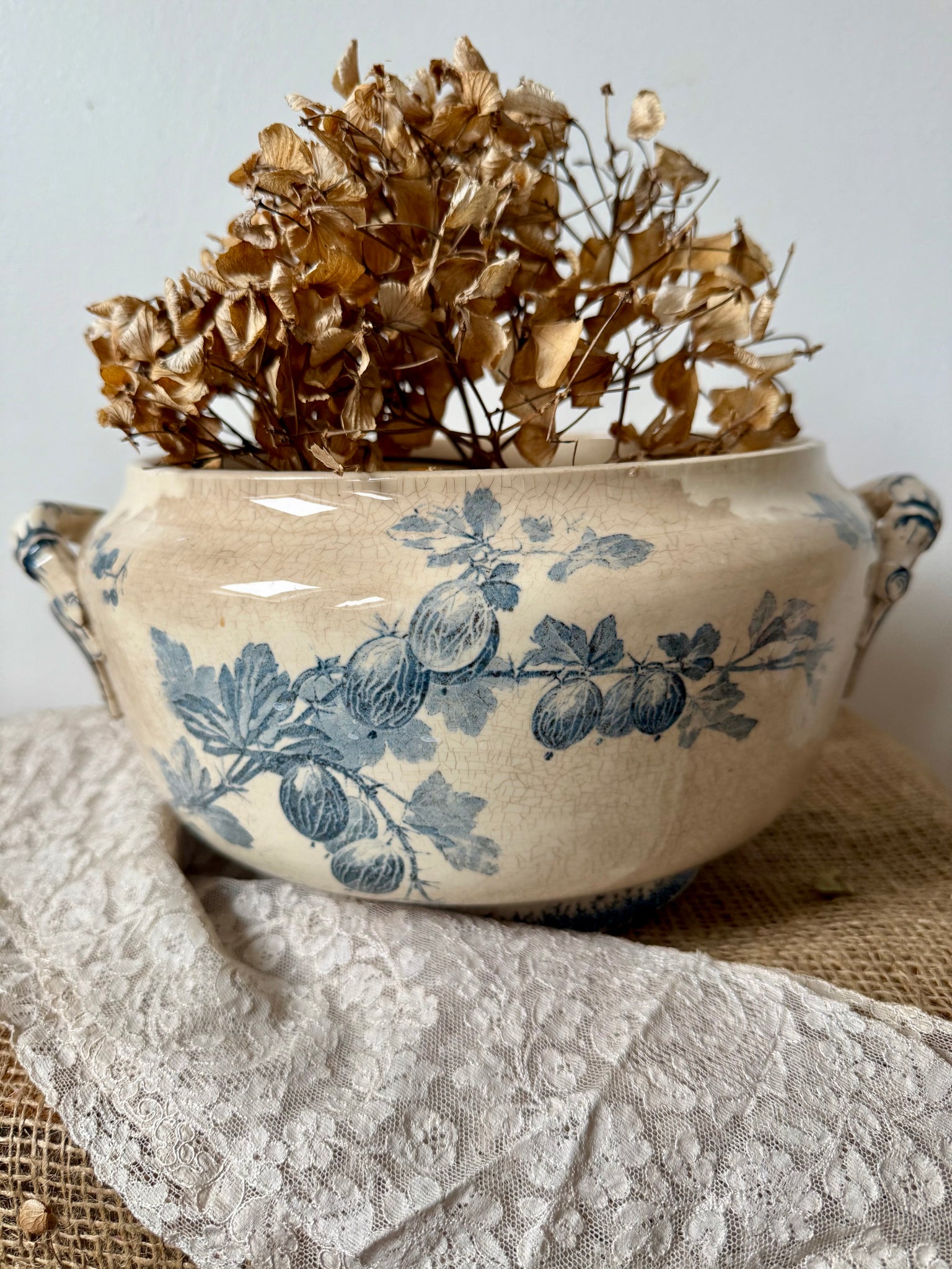 Lovely crazed and extremely buttery French soupiere, decorated with what looks like gooseberry and bamboo style type handles 30 cm x 15 cm. Never seen one like this before it’s lovely.