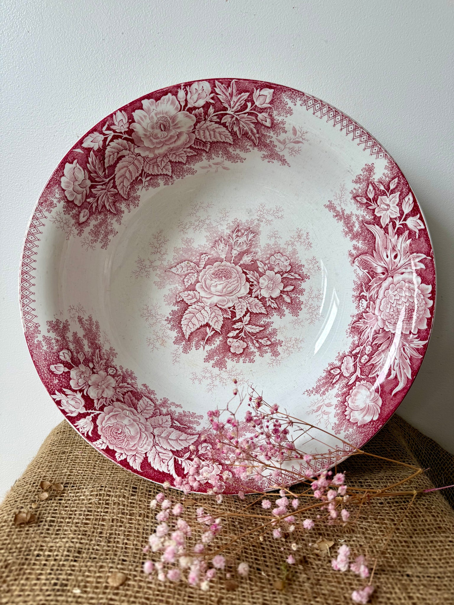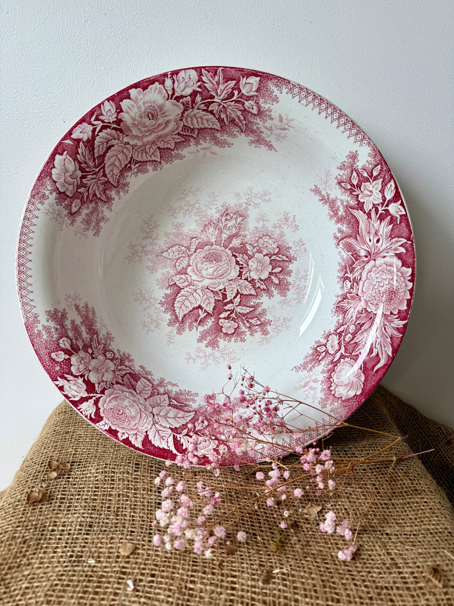 French Sarreguimes jardiniere pink transferware bowl, in beautiful condition Great spring piece 35 cm 44cm