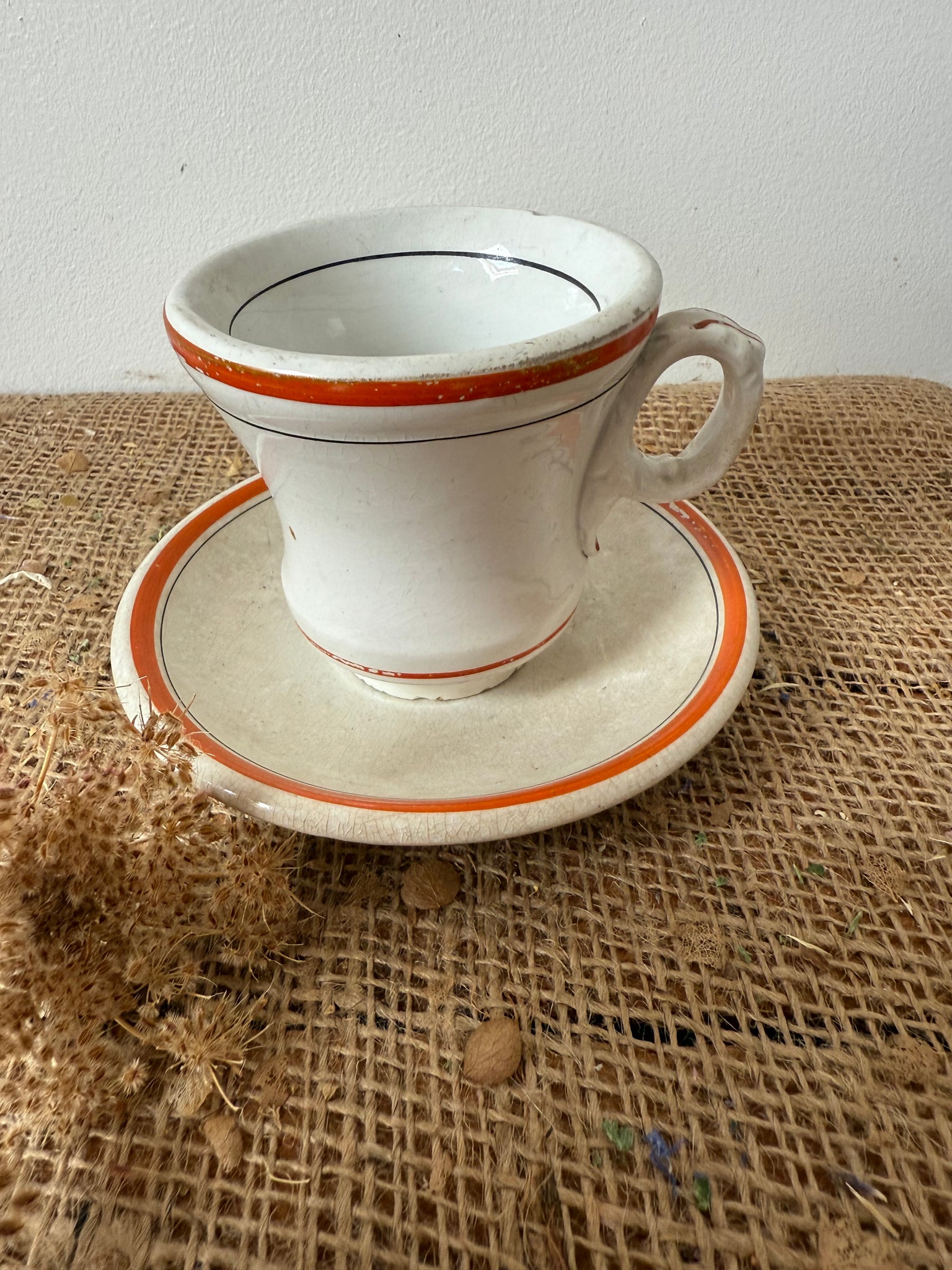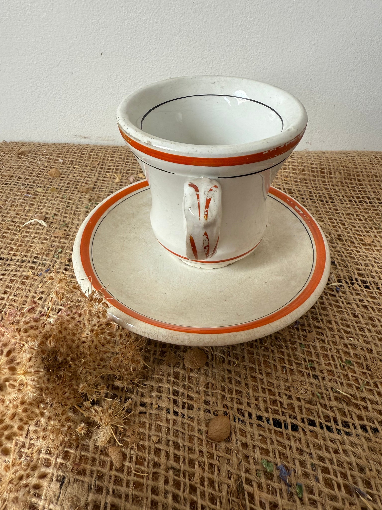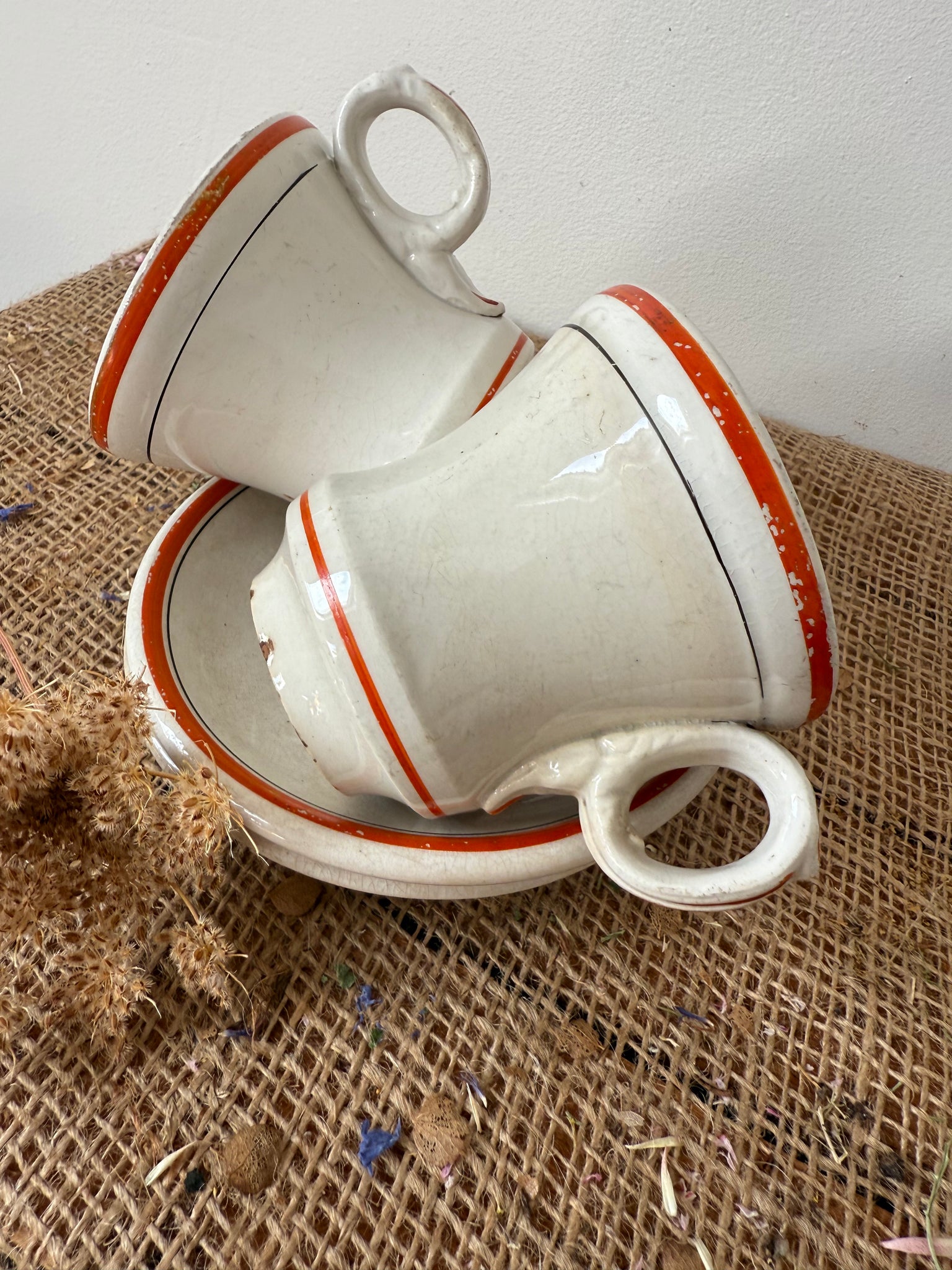 Gorgeous zingy colour to these French brulot cups and saucers, bought in Amiens super display pieces but also completely usable, my OH uses his every day.. has some gentle paint wear to them as someone must have loved these as much as I do! These are sold as a cup and saucer and I have 2 available, price is per cup and saucer.
