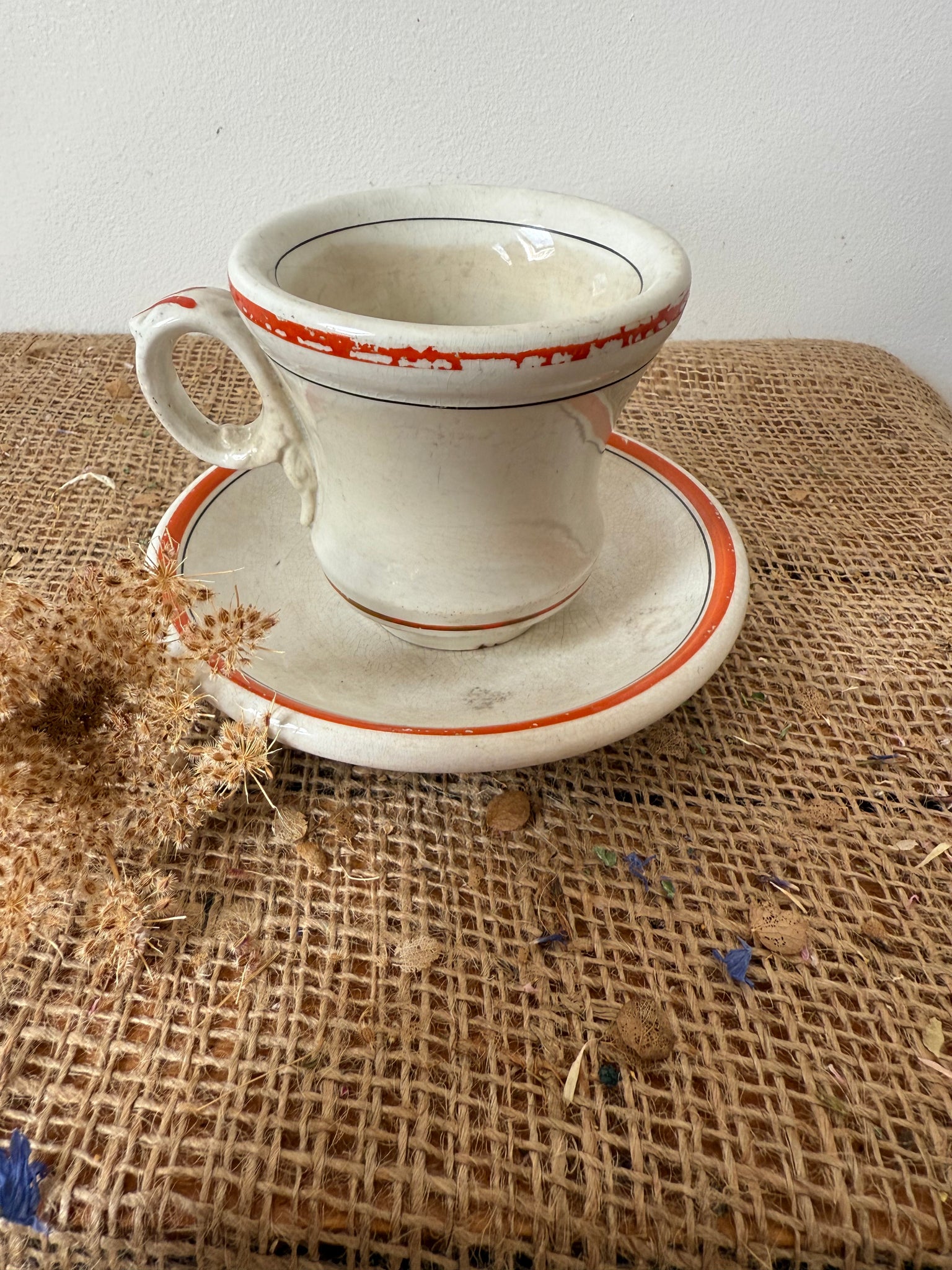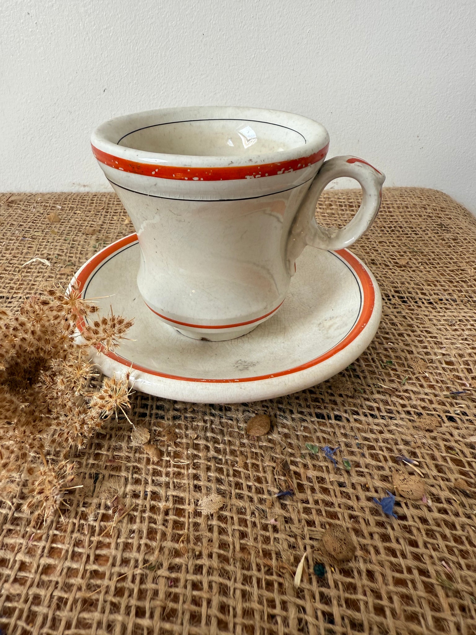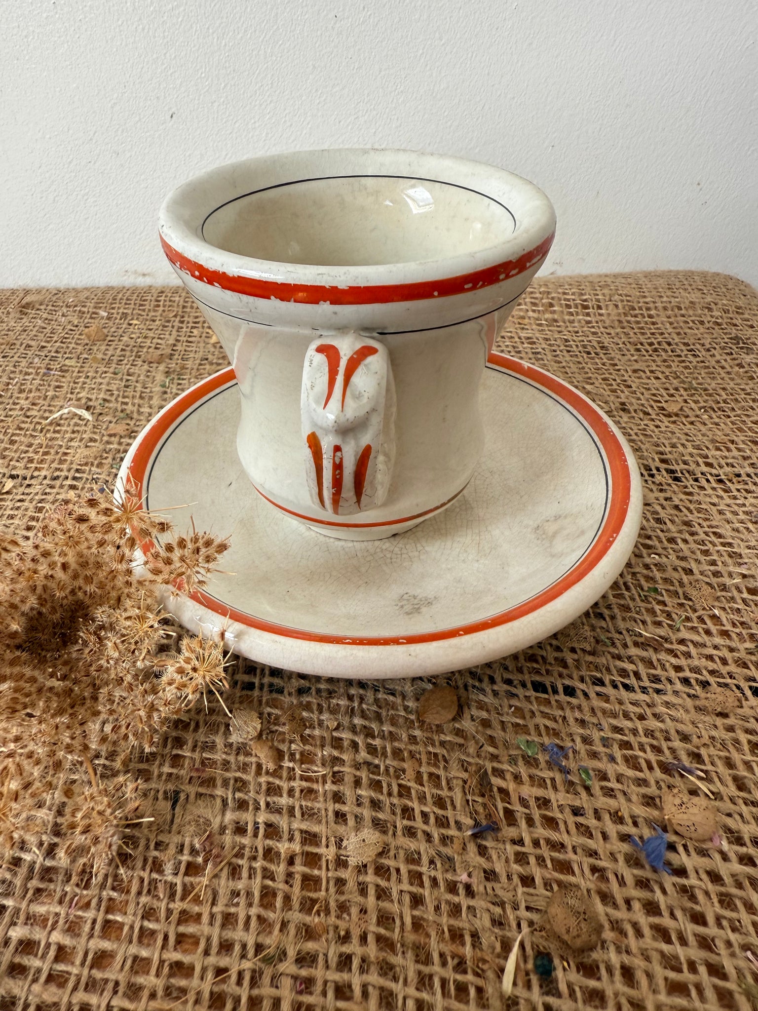 Gorgeous zingy colour to these French brulot cups and saucers, bought in Amiens super display pieces but also completely usable, my OH uses his every day.. has some gentle paint wear to them as someone must have loved these as much as I do! These are sold as a cup and saucer and I have 2 available, price is per cup and saucer.