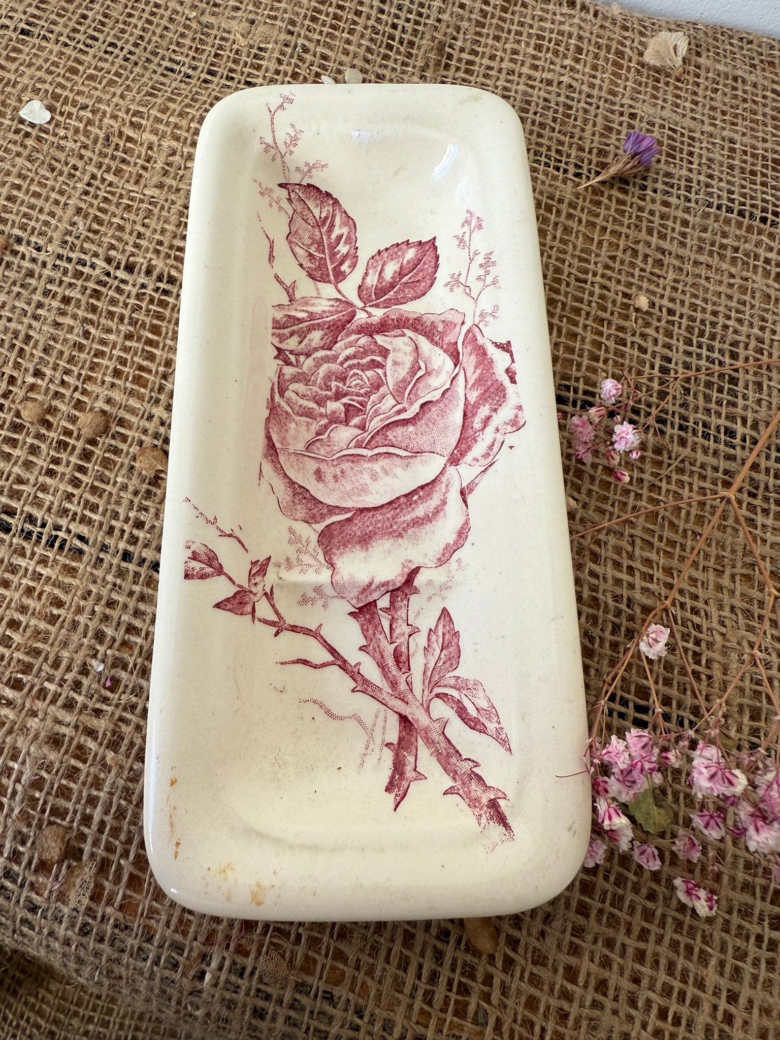 French ironstone soap or toothbrush dish decorated with beautiful pink rose 19.5 x 9cm just so pretty