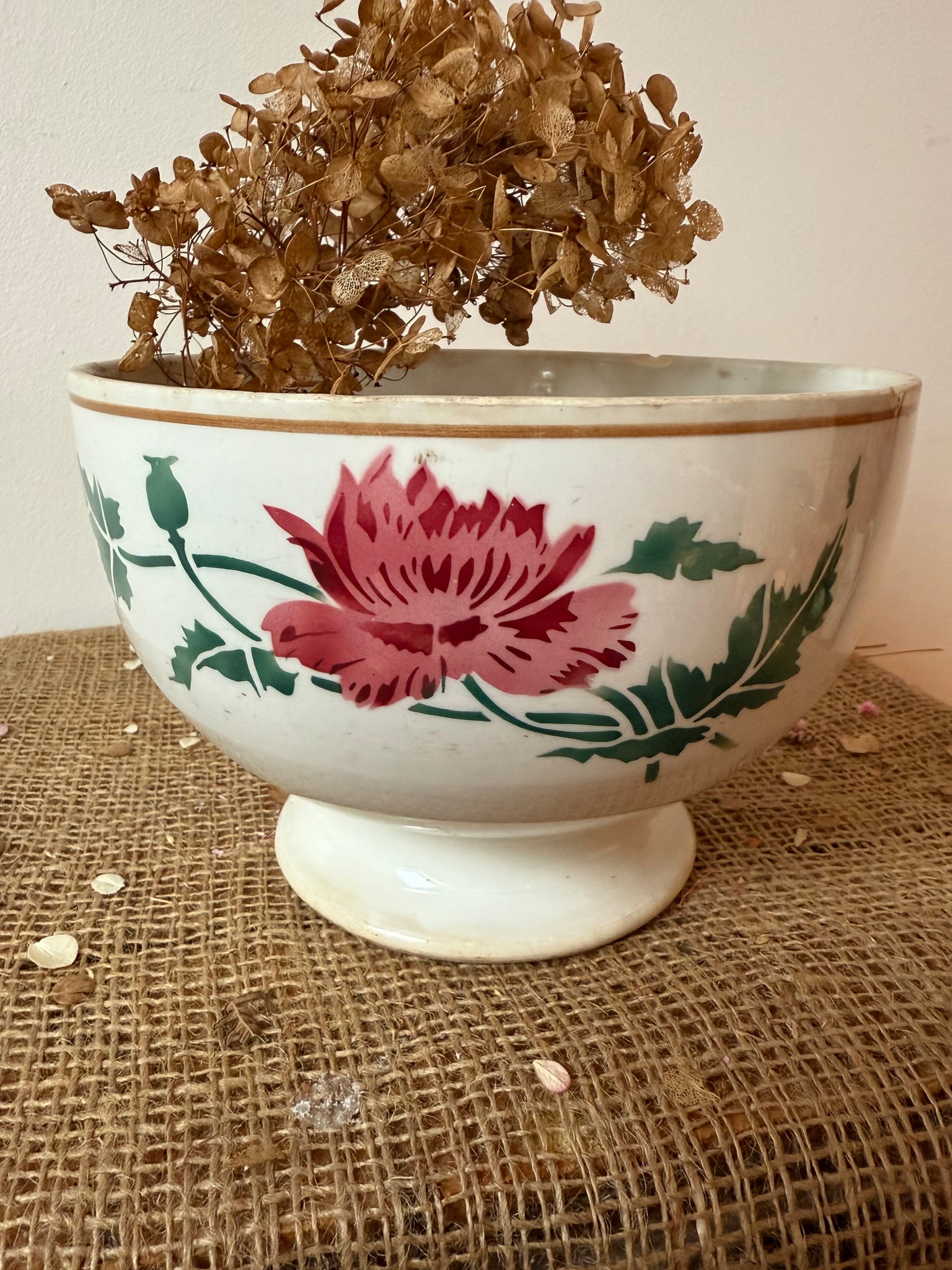 Super large French deep bowl decorated in pink ponly florals and poppy seed heads 13 x 8 x 18.5cm a seriously large café au lait. Would make a super fruit bowl.