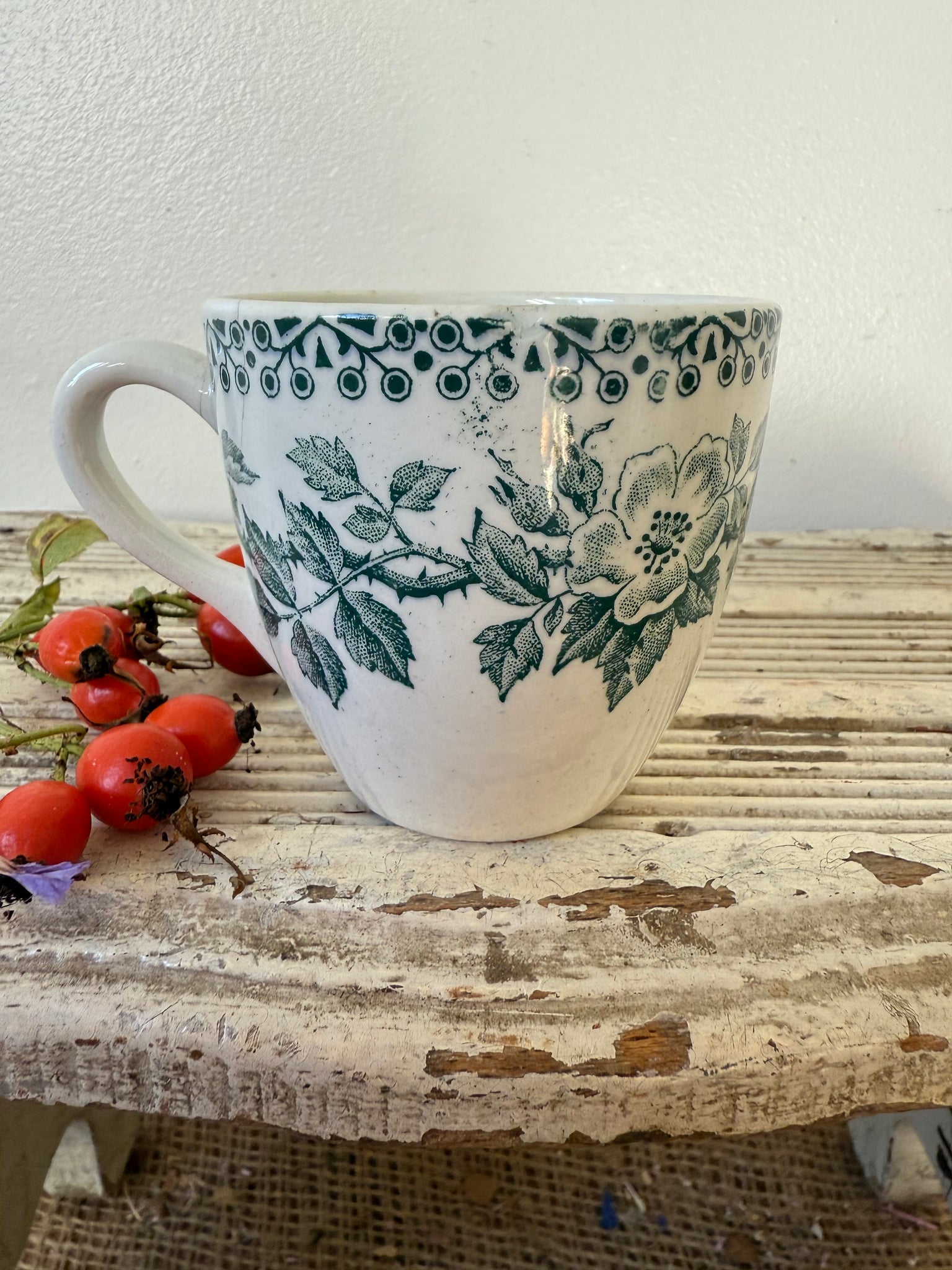 Small bramble flowered green iron stone cup, 7 cm has a teeny hairline around the rim but a super little piece