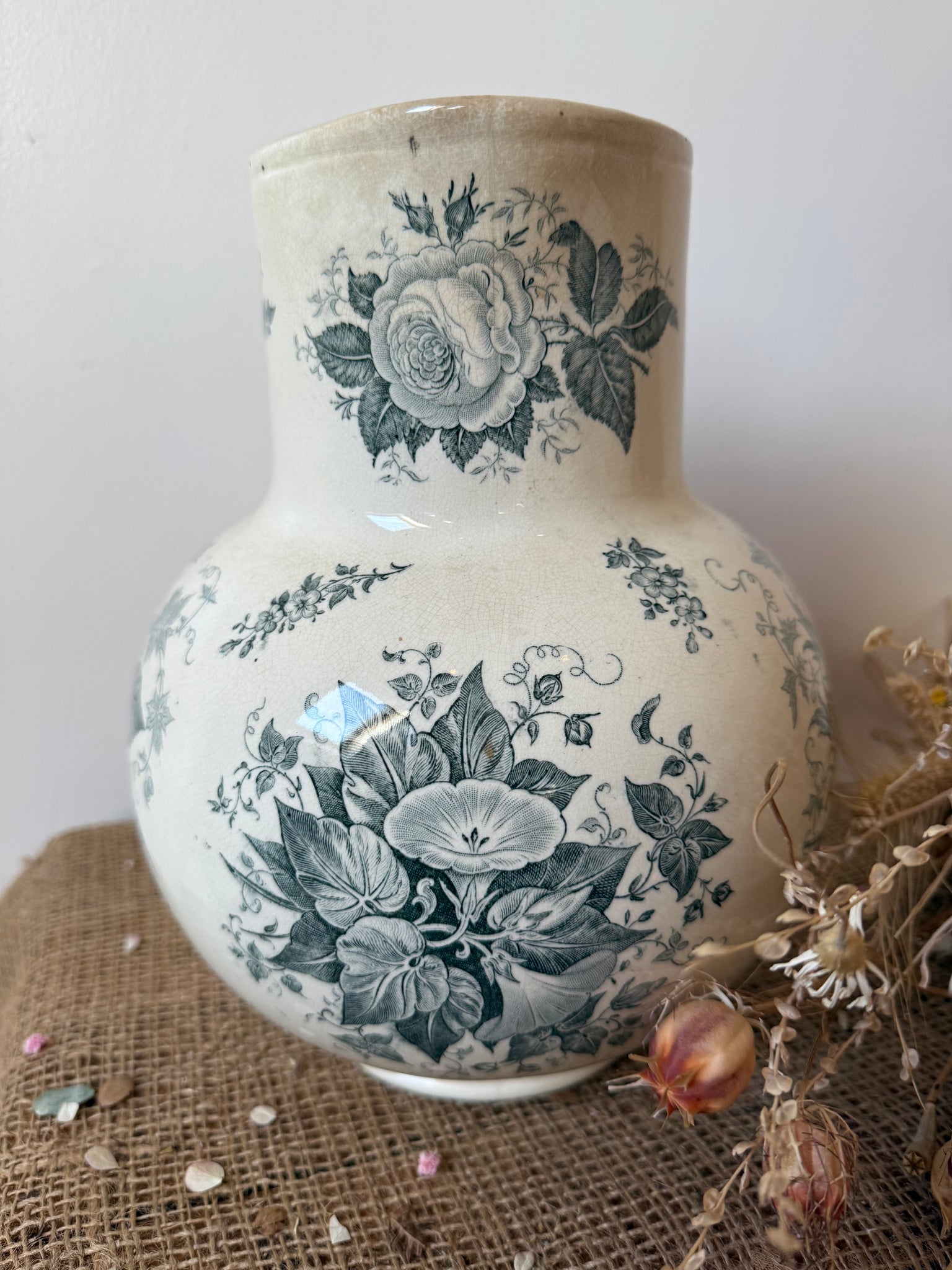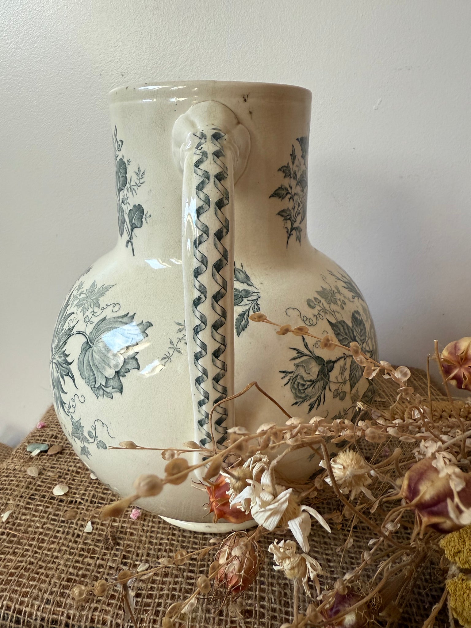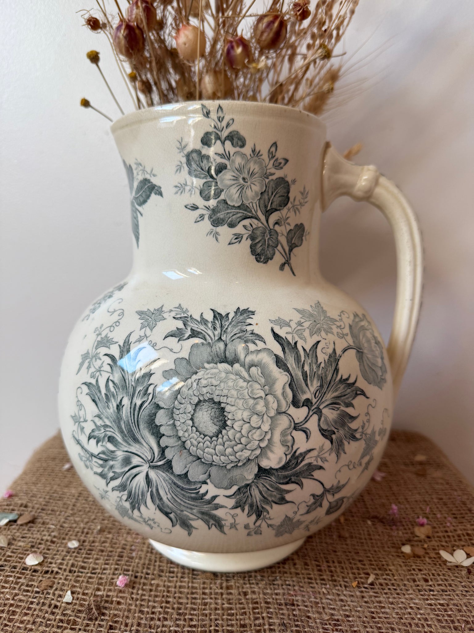 French vintage large ironstone jug, in beautiful muted tones of greeny grey, in super condition. These don’t come along very often and it’s an absolute beauty.. 27 cm x 19