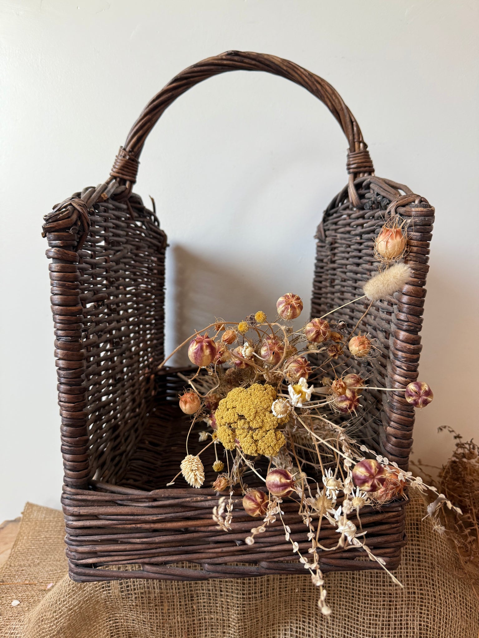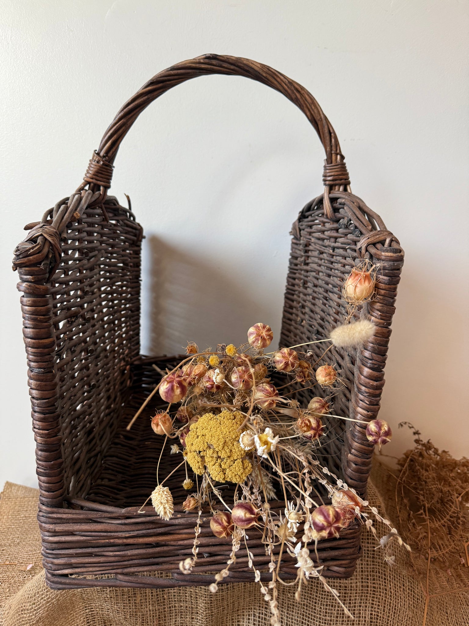 Gorgeous texture and completely rustic! Sturdy vintage wicker log basket, these also look great hung up and filled with dried flowers. In great condition