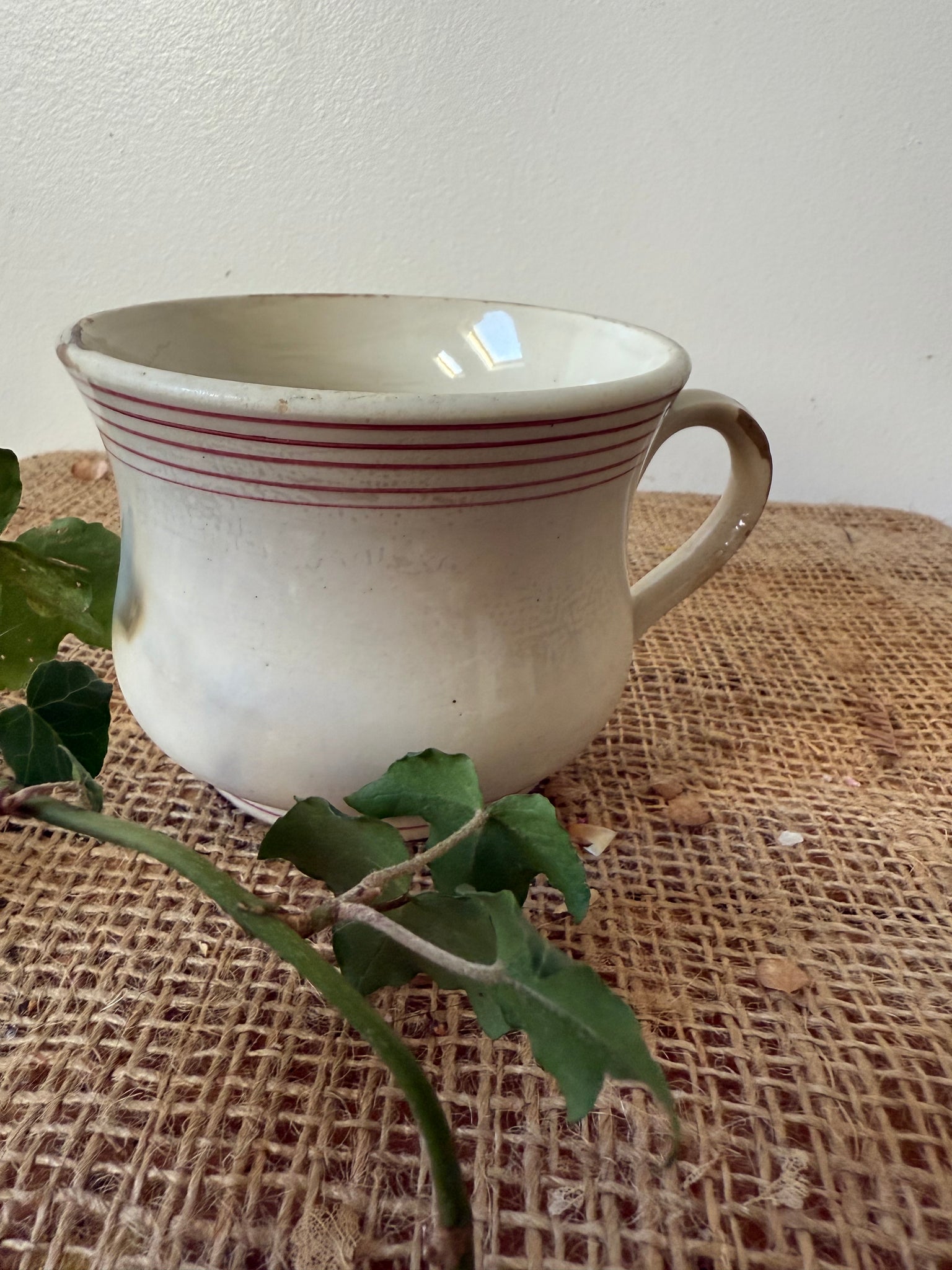 Large vintage French chocolat mug number with gentle pink stripes 13 cm to handle by 8 cm.. I live these huge cups amd this one is gorgeous!!
